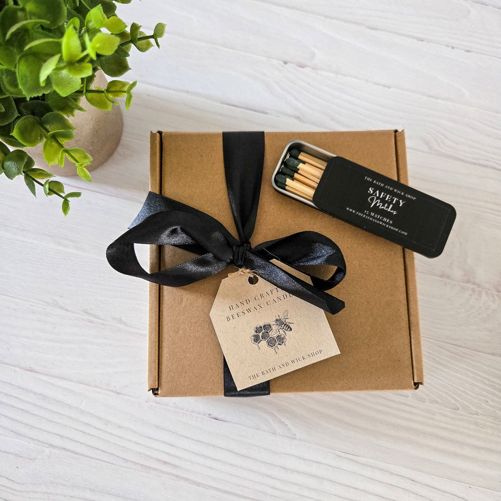 Gift Box Contains four 4 oz tin candles and a tin with 15 3 inch safety matches. Comes gift ready with a beautiful black satin ribbon and a kraft tag.